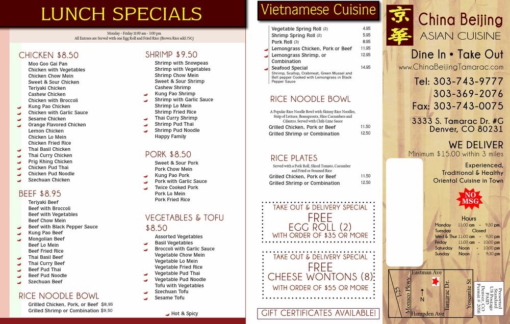 China Beijing is a casual yet classy Chinese restaurant located in Denver, CO. They offer a variety of amenities like reservations, delivery, and vegetarian options. With a focus on traditional Chinese dishes, their menu features appetizing options like Egg Drop Soup, Lemon Chicken, Sesame Chicken, Orange Chicken, and General Tso's Chicken. Customers rave about the delicious food, clean and quiet ambiance, and friendly service. Whether you're dining in, ordering takeout, or having a catered event, China Beijing promises a satisfying experience. Don't miss out on their flavorful dishes and generous portions that will have you coming back for more.