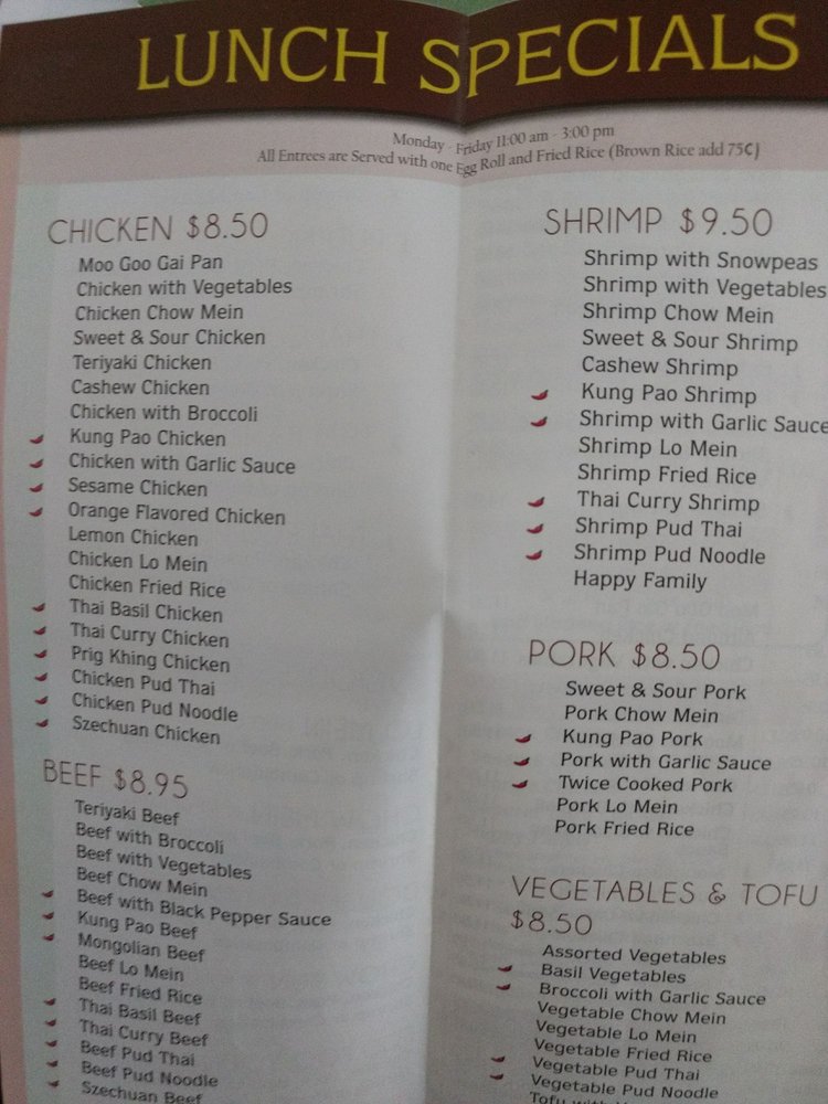 A Szechuan inspired dish with shrimp, peanuts and vegetables in spicy chili sauce. Served with one egg roll and fried rice. Spicy.
